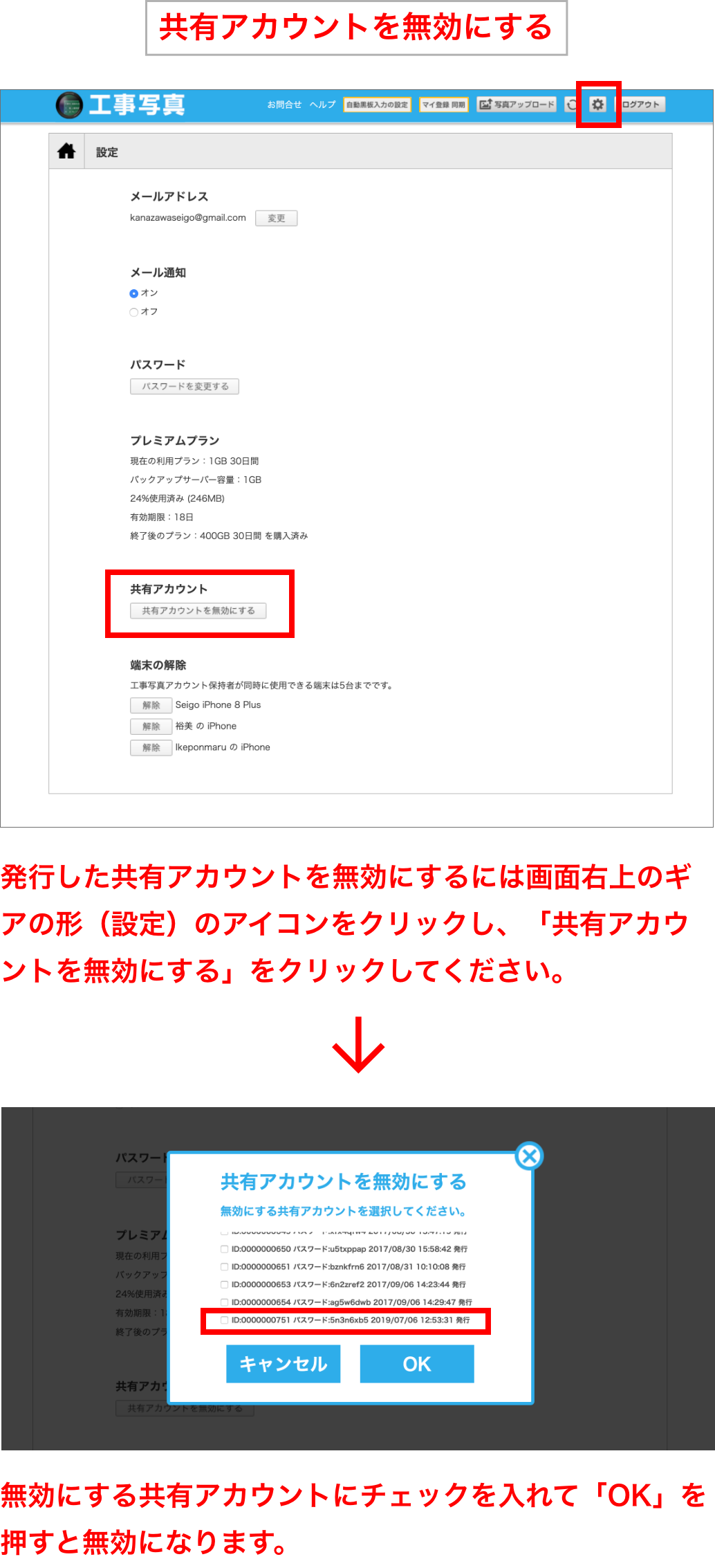 ● 工事が終了し発行した共有アカウントが必要なくなった際には共有アカウントを無効にしてください。ウェブブラウザ側設定画面の「共有アカウントを無効にする」ボタンを押すと発行した共有アカウントの一覧が表示されますので、無効にしたい共有アカウントを選択してOKを押します。